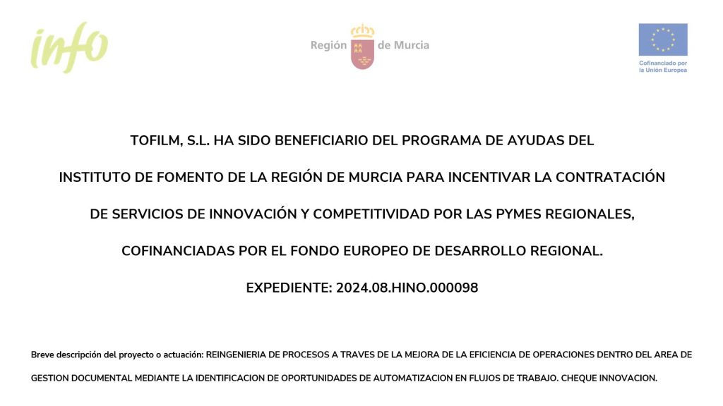 Estamos trabajando en la mejora y optimización de nuestros procesos empresariales para seguir ofreciendo el mejor servicio y aumentar nuestra eficiencia interna, gracias al apoyo del Instituto de Fomento de la Región de Murcia (INFO) con la concesión del Cheque Innovación, dentro del Programa de Reingeniería de Procesos Empresariales cofinanciado por el FEDER 2021-2027 de la Región de Murcia. Seguimos apostando por